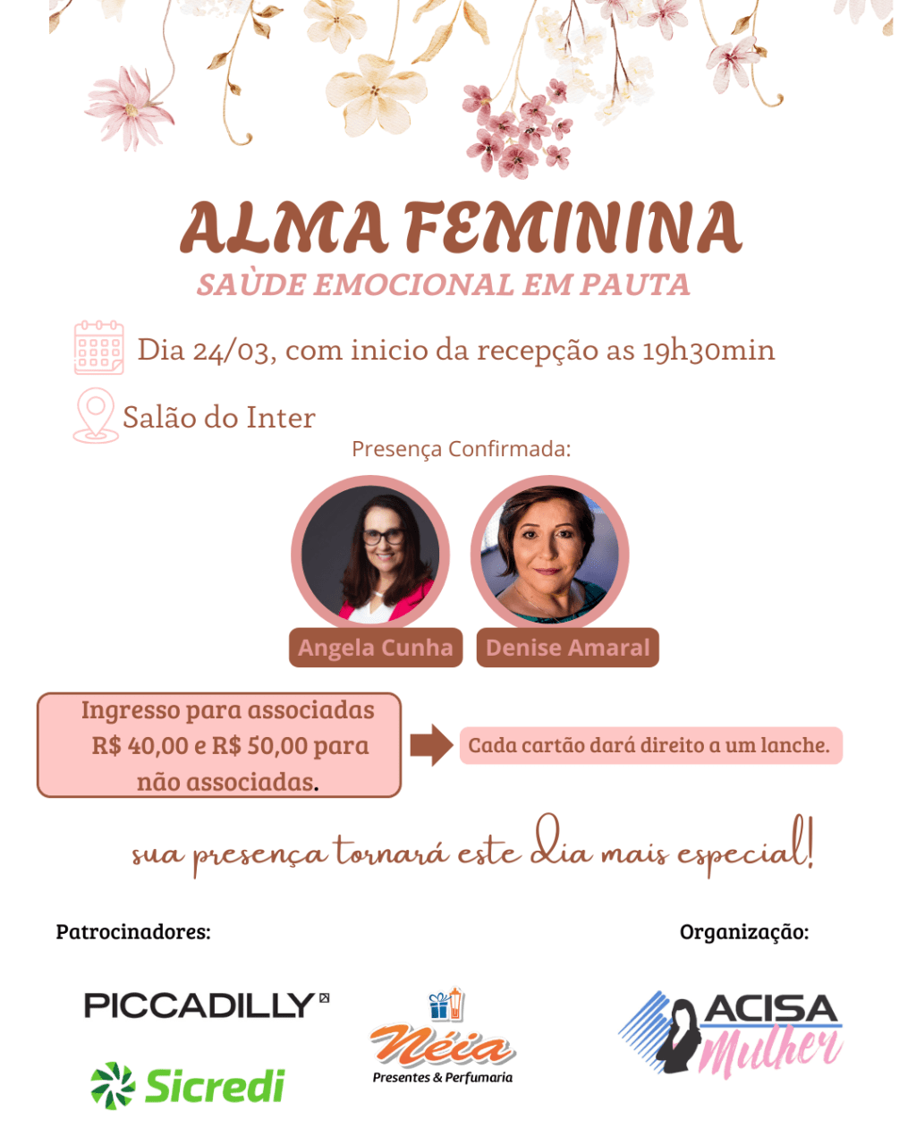 Neste ano, o Núcleo ACISA Mulher convida você para uma roda de conversa especial sobre a conexão entre saúde física e emocional. Um momento de troca, aprendizado e acolhimento, pensado para fortalecer o bem-estar das mulheres.